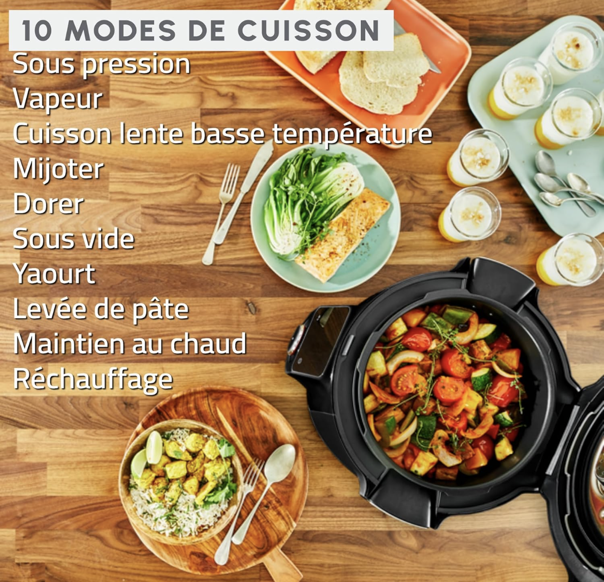 - 10 MODES DE CUISSON : cuisson sous pression, cuisson vapeur, mijoter, dorer, cuisson lente à basse température, cuisson sous-vide, yaourts, levée de pâte (pain, brioche…), réchauffer, maintien au chaud